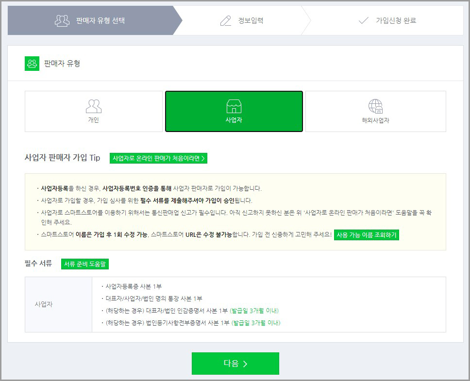 3. 판매자 유형에서 사업자를 클릭해 주세요.